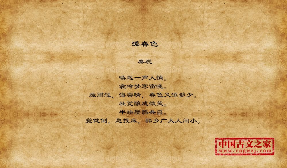 秦观(1049-1100)字太虚,又字少游,别号邗沟居士,世称淮海先生。汉族,北宋高邮(今江苏)人,官至太学博士,国史馆编修。秦观一生坎坷,所写诗词,