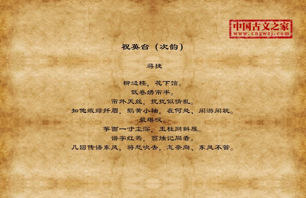 蒋捷(生卒年不详),字胜欲,号竹山,宋末元初阳羡(今江苏宜兴)人。先世为宜兴巨族,咸淳十年(1274)进士。南宋亡,深怀亡国之痛,隐居不仕,人称“竹山