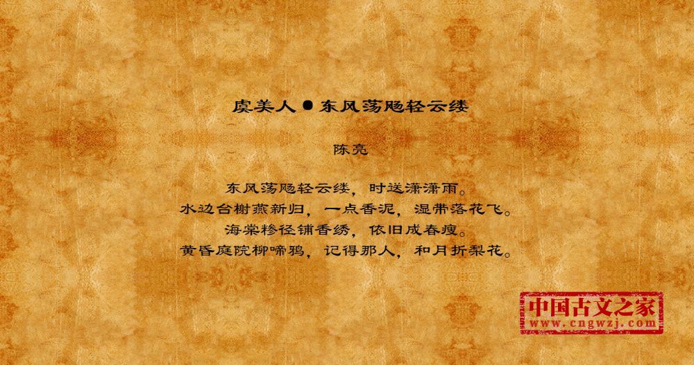 东风荡漾轻云缕,时送萧萧雨。水边画榭燕新归,一口香泥湿带、落花飞。 海棠糁径铺...