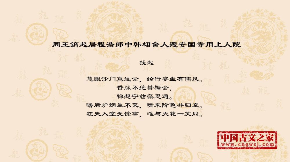 钱起(751年前后在世),字仲文,汉族,吴兴(今浙江湖州市)人,早年数次赴试落第,唐天宝七年(748年)进士。唐代诗人。