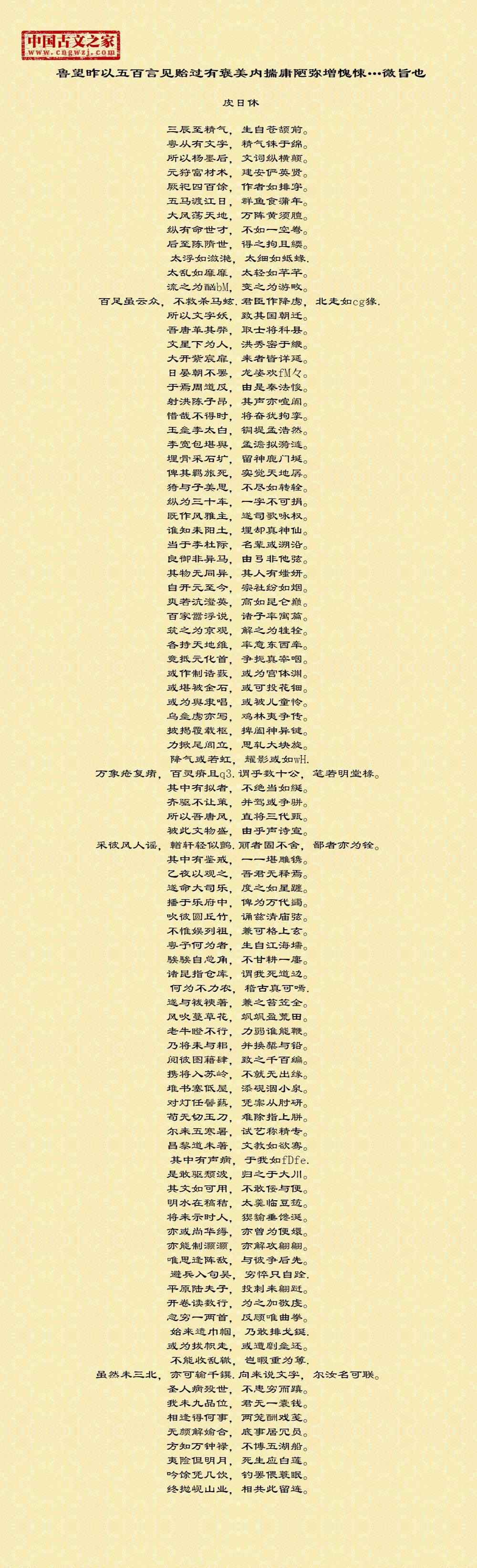 皮日休,字袭美,一字逸少,生于公元834至839年间,卒于公元902年以后。曾居住在鹿门山,自号鹿门子,又号间气布衣、醉吟先生。晚唐文学家、散文家,与