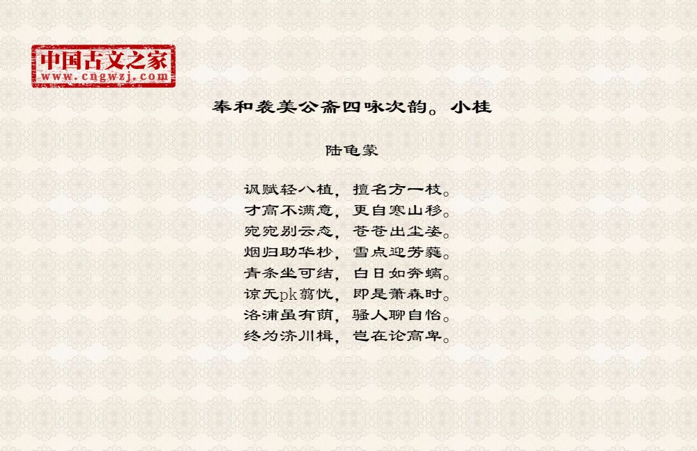 陆龟蒙(?~公元881年),唐代农学家、文学家,字鲁望,别号天随子、江湖散人、甫里先生,江苏吴县人。曾任湖州、苏州刺史幕僚,后隐居松江甫里,编著有《甫
