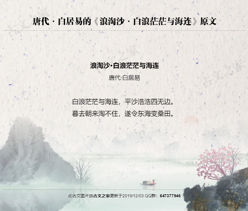 是《浪淘沙》,使用了“浪淘沙”曲牌,是作者白居易在奔波中写下的。白居易号香山居士,著有《白氏诗集》