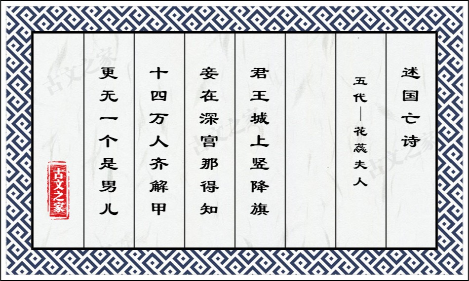君王城上竖降旗,妾在深宫那得知? 十四万人齐解甲,更无一个是男儿! ...