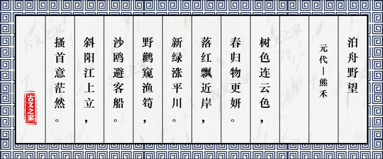落红飘近岸,新绿涨平川。野鹳窥渔笱,沙鸥避客船。斜阳江上立,搔首意茫然。