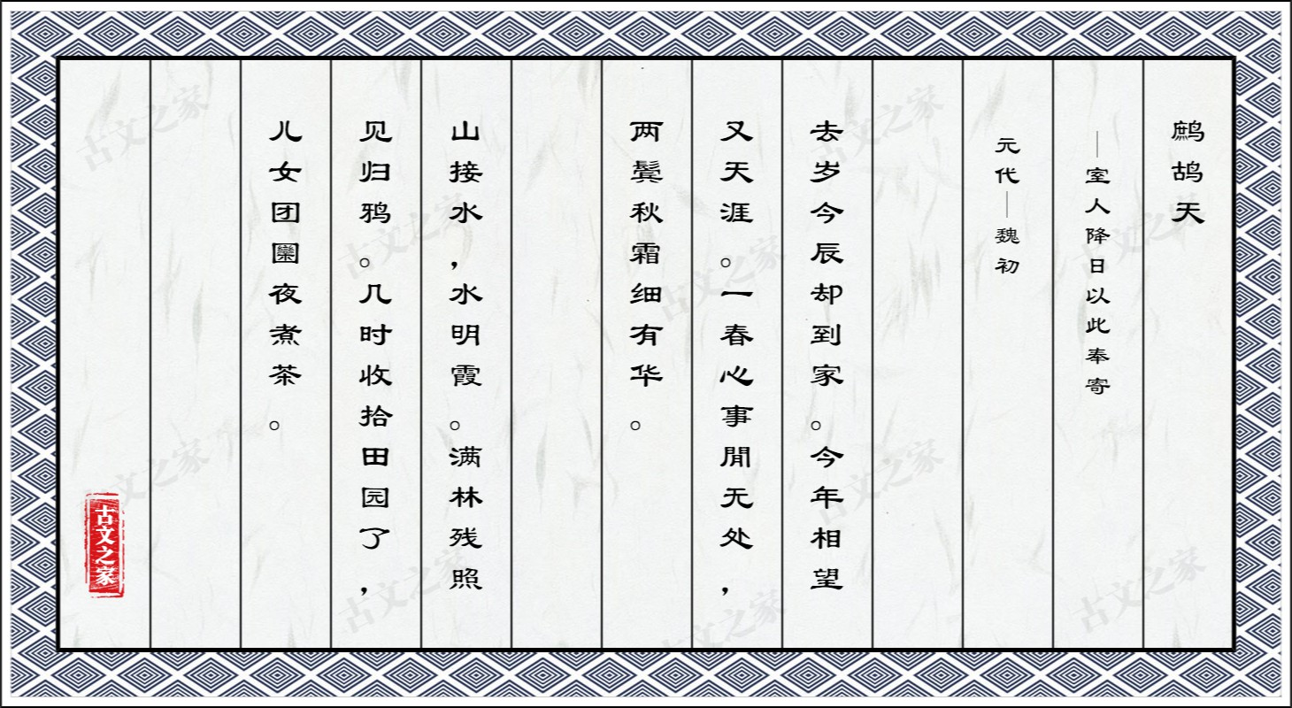 去岁今辰却到家。今年相望又天涯。一春心事閒无处,两鬓秋霜细有华。 山接水,水明霞。满林残照见归鸦。几时收拾田园了,儿女团圞夜煮茶。