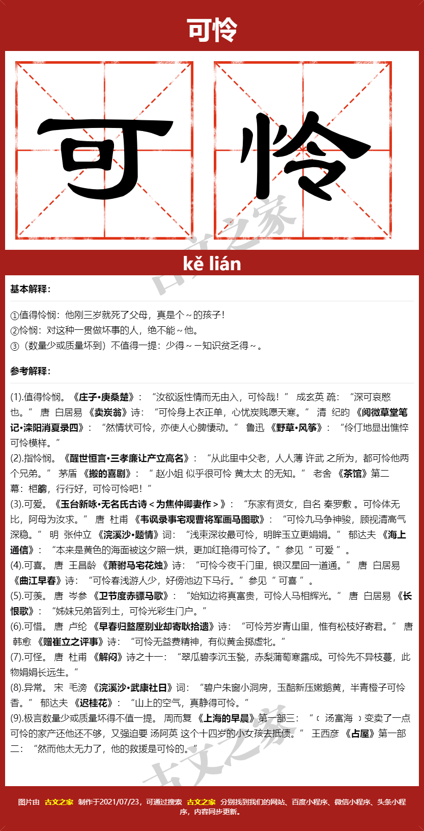 参考解释: (1).值得怜悯。《庄子·庚桑楚》:“汝欲返性情而无由入,可怜哉!” 成玄英 疏:“深可哀愍也。” 唐 白居易 《卖炭翁》诗:“可怜身上衣正单,心忧炭贱愿天寒。” 清 纪昀 《阅微草堂笔记·滦阳消夏录四》:“然情状可怜,亦使人心脾悽动。” 鲁迅 《野草·风筝》:“伶仃地显出憔悴可怜模样。” |