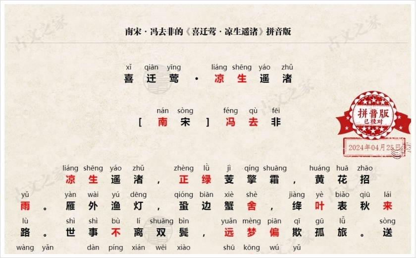 拼音全文:(我们坚持对每一篇古诗文进行人工查证并注音、我们亲自查证并回复来自您的每一次纠错,只为给您一份更为准确的拼音版本,请记住我们:古文之家)本页最后更新时间:2025/7/24 22:46:13