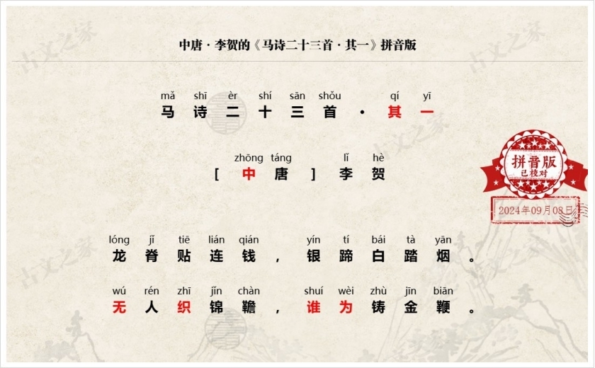 《马诗二十三首·其一》拼音版、节奏划分及断句,可打印李贺