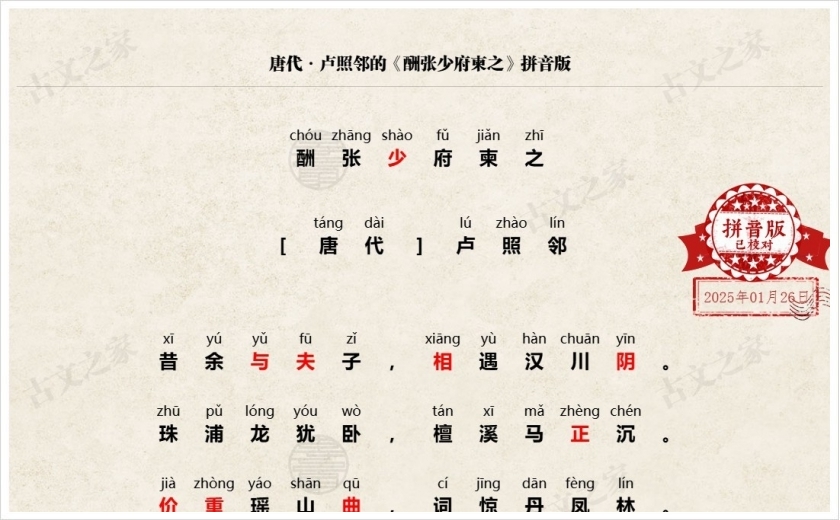 昔余/与夫子,相遇/汉川阴。珠浦/龙犹卧,檀溪/马正沉。价重/瑶山曲,词惊/丹凤林。十年/睽赏慰,万里/隔招寻。毫翰/风期阻,荆衡/云路深。鹏飞/俱望昔,蠖屈/共悲今。谁谓/青衣道,还叹/白头吟。地接/神仙涧,江连/云雨岑。飞泉/如散玉,落日/似悬金。重以/瑶华赠,空怀/舞咏心。