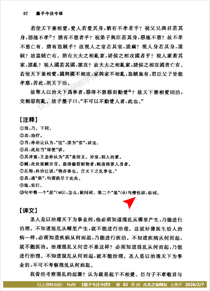 察此何自起?皆起不相爱。 , ,犹有不孝者乎? ,恶施不孝? ?视弟子与臣若其身, ?故不孝不慈亡。 ?故视人之室若其室, ?视人身若其身, ?故盗贼有亡。 ,诸侯之相攻国者乎? ,谁乱? ,谁攻? ,诸侯之相攻国者有亡。若使天下兼相爱,国与国不相攻, ,盗贼无有, ,若此则天下治。 ,恶得不禁恶而劝爱! ,交相恶则乱。 :“不可以不劝爱人”者, 。
