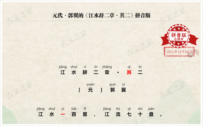 (我们坚持对每一篇古诗文进行人工查证并注音、我们亲自查证并回复来自您的每一次纠错,只为给您一份更为准确的拼音版本,请记住我们:古文之家)