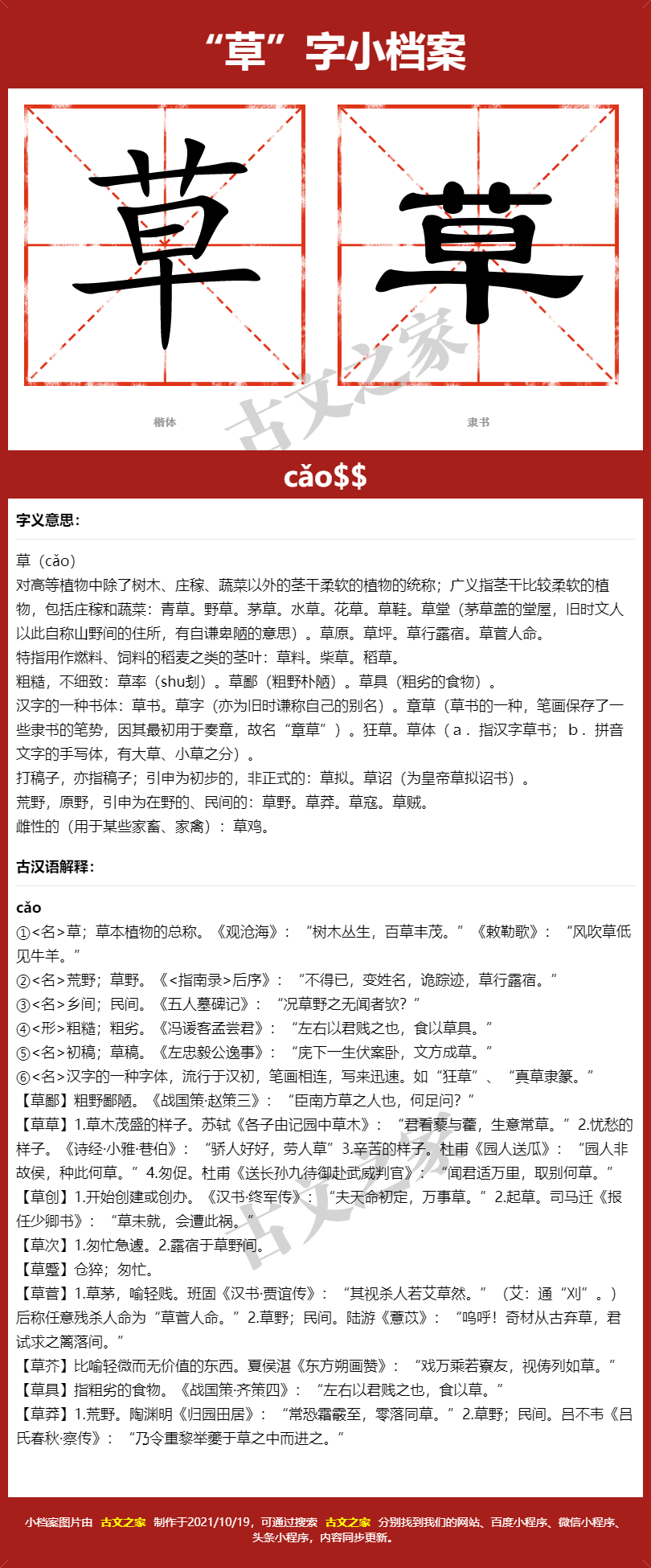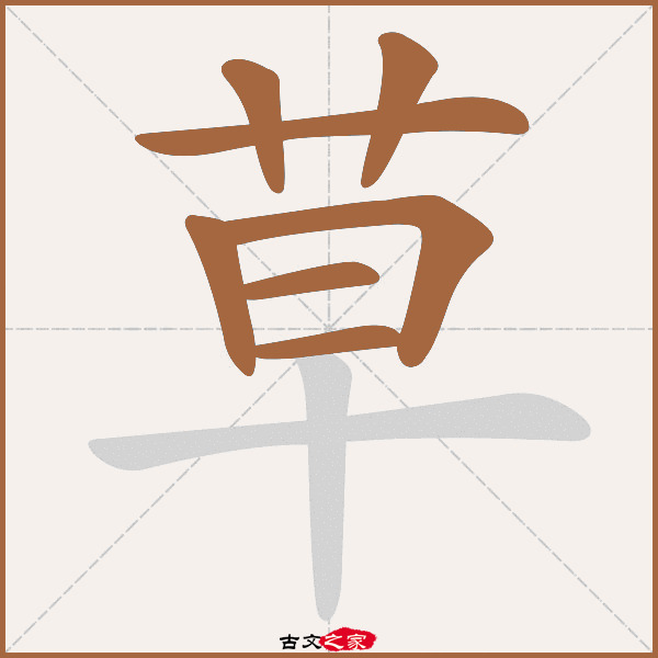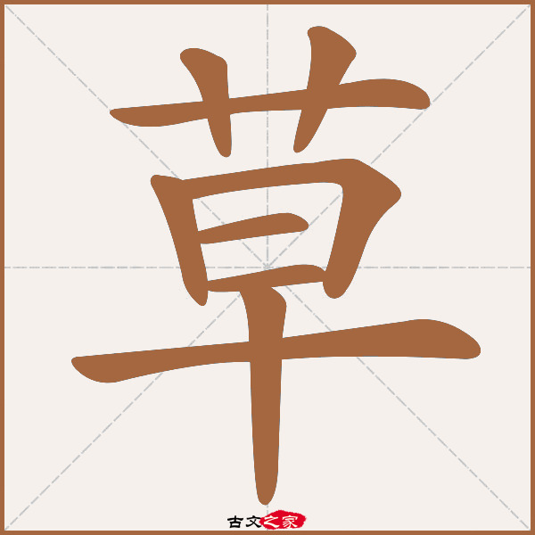 基础信息 | “草”字,繁体为:草,仓颉代码为:TAJ,四角号码:44406,五笔输入法:AJJ,uicode代码为:U+8349,郑码为:EKED,电码:-,规范字编号:1408, “草”字,部首为:艹,总笔画:九画,部外笔画:六画,字形分解:艹早(caozao),汉字构造:艹日十,,汉字吉凶:吉,属姓氏, 笔画顺序:一丨丨丨フ一一一丨, 笔画顺序读作:横竖竖竖折横横横竖, “草”字在在《康熙字典》位置:《康熙字典》第1030页 第17字, 宋本广韵中描述:-, 其它字典出处:[ 古文字诂林 ]:01册,第14部,艸部,438,[ 故训彙纂 ]:1926|2004.6,[ 说文解字 ]:编号0679,第01卷下,艸部第438字,[ 康熙字典 ]:页1030第17, |